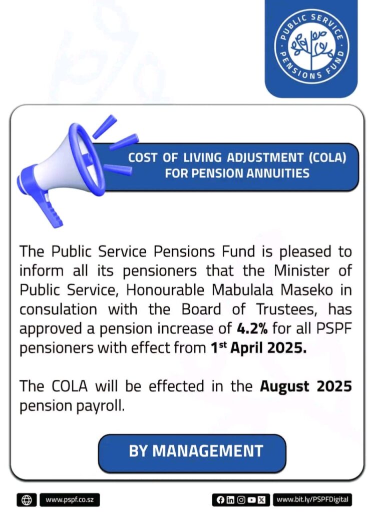 MBABANE – The Public Service Pensions Fund (PSPF) has announced 4.2% pension annuities increment that would caution over 20 000 pensioners.