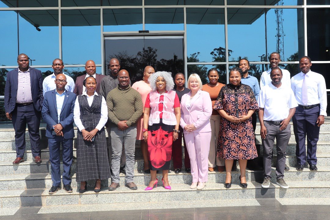 Officials from the Ministry of Information, Communications and Technology’s RSTI department pose for a group photo with learners and teachers at Mpaka High School after concluding the first cohort of the National STEM Mentorship and Science in Uniform Back to School Campaign.