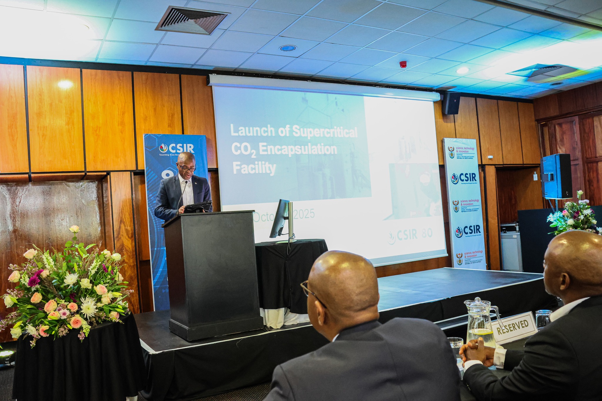 Director-General of the Department of Science, Technology and Innovation, Dr Mlungisi Cele, delivers the keynote address at the launch of Africa’s first Supercritical CO₂ Encapsulation Facility at CSIR.