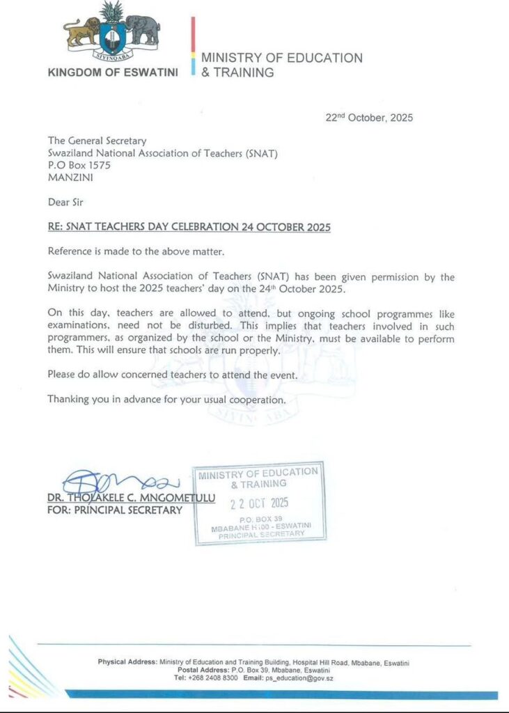 MBABANE – The Ministry of Education and Training has officially granted teachers the permission to attend the 2025 Teachers’ Day organised by the Swaziland National Association of Teachers (SNAT) on October 24, 2025.