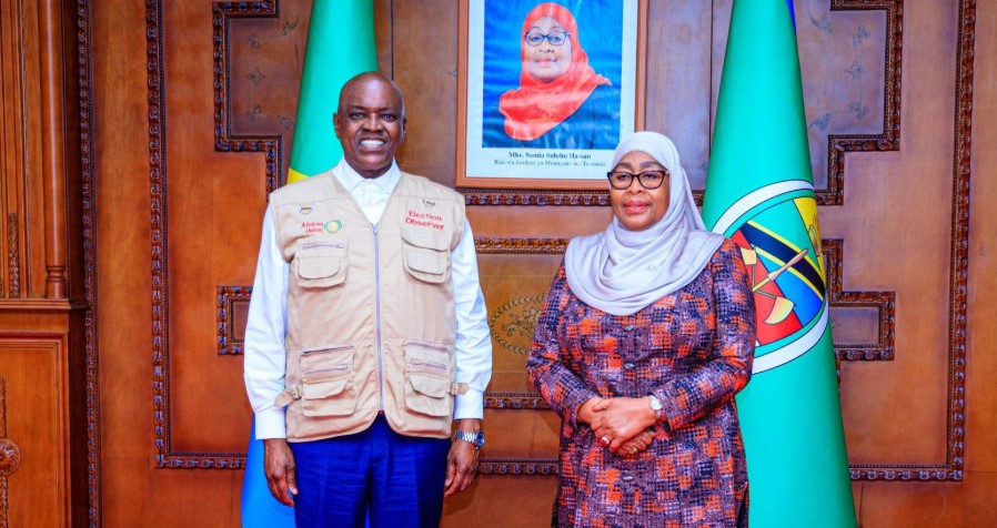 Former Botswana President Mokgweetsi Masisi meets Tanzanian President Samia Suluhu Hassan during the AU Election Observation Mission in Dar es Salaam.