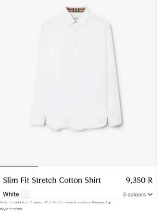 On Wednesday, Matlala started the appearance on a white R9,350 priced Burberry shirt. Matlala arrived in a crisp, slim-fit stretch white Burberry shirt paired with beige trousers, a look far more understated than his usual flamboyant courtroom ensembles. Yet despite the toned-down approach, the price tag of the high-end shirt ensured he still dominated attention the moment he walked in.