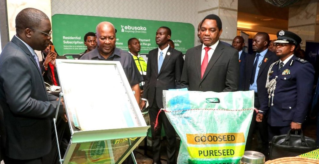 Zambian President Hakainde Hichilema and Ghanaian President John Dramani Mahama examine local farm produce during the Ghana–Zambia business dialogue in Lusaka.