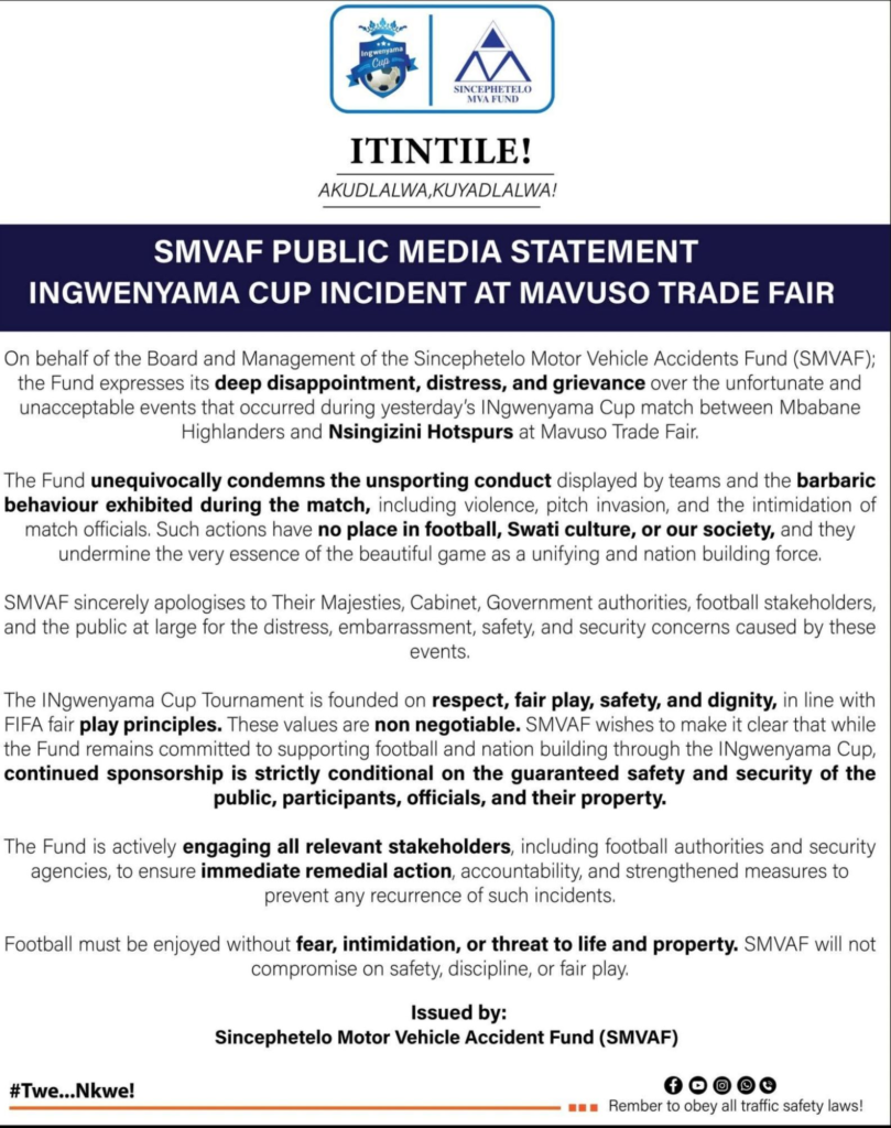 MBABANE – The Sincephetelo Motor Vehicle Accidents Fund has expressed shock and dismay over the violent incidents during the Ingwenyama Cup match between Mbabane Highlanders and Nsingizini Hotspurs at the Mavuso Trade Fair.