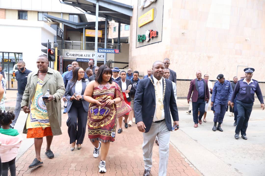 Princess Sakhizwe led the delegation as they crossed from Swazi Plaza Properties toward The Mall and New Mall on Dr Sishayi Road, where they were warmly received by Nhlanhla Nkonyane of The Mall and New Mall. The tour offered an exclusive preview of how the precinct will be transformed into a well curated local superstore showcasing the very best of products and services made in Eswatini.